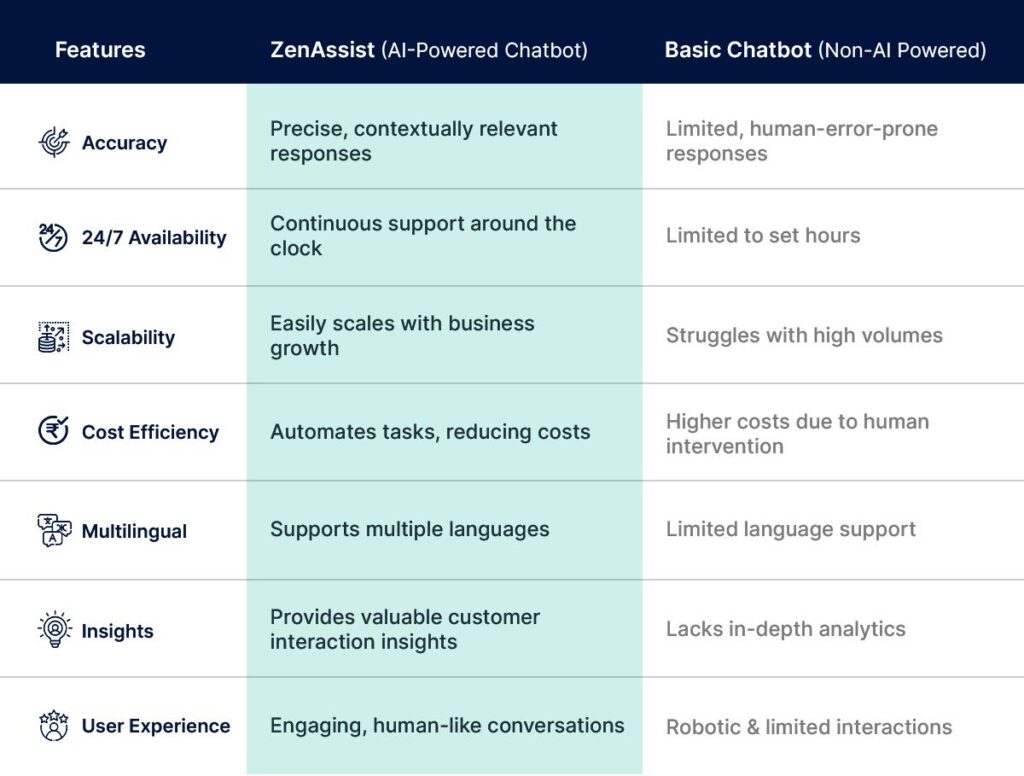 ZenAssist stands out from basic chatbots by offering advanced features such as custom knowledge base integration, higher accuracy in responses, round-the-clock availability, and significant cost savings through automation. Our platform is designed to provide superior customer support and enhance overall service efficiency.